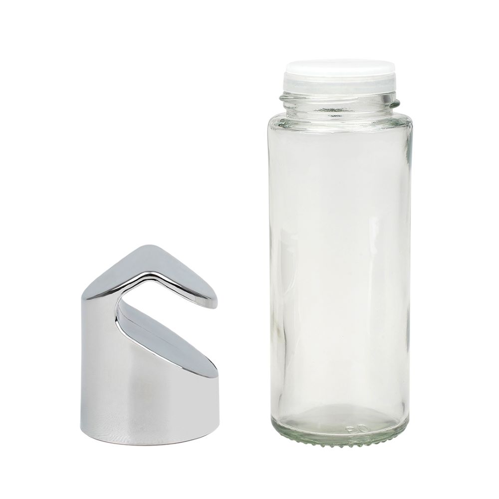 Стеклянная навесная баночка для хранения сыпучих продуктов и специй оснащена специальной крышкой, благодаря которой баночка легко крепится на трубе рейлинга.