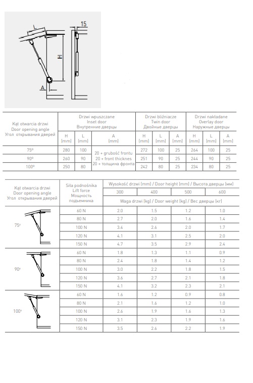 Максимальная допустимая нагрузка составляет 8 кг, что позволяет использовать его с различными типами фасадов. Для удобства и надежности рекомендуется устанавливать два газлифта на один фасад, что поможет обеспечить более равномерное распределение нагрузки и продлить срок службы механизма.