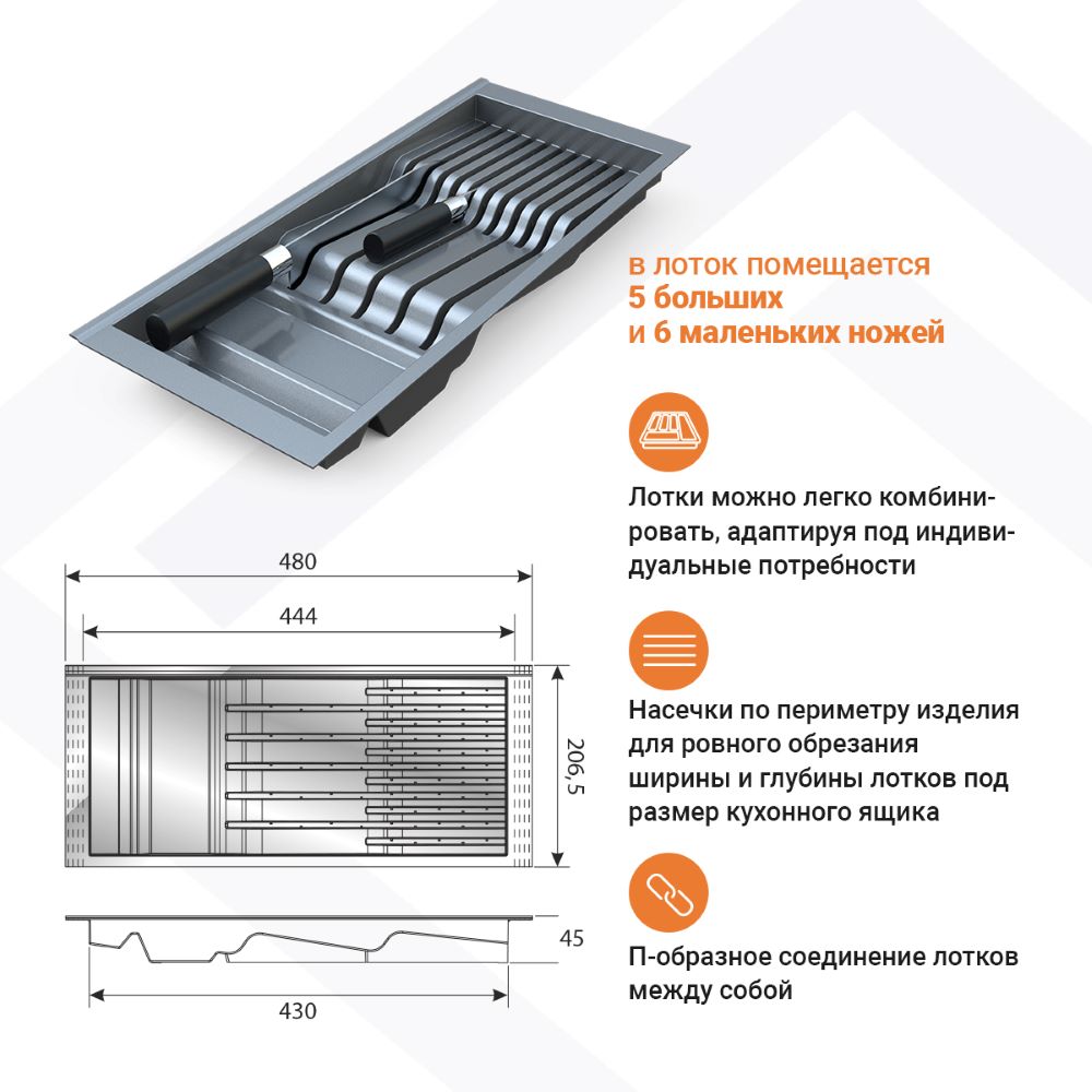 • Насечки по периметру изделия для ровного обрезания ширины и глубины лотков под размер кухонного ящика.