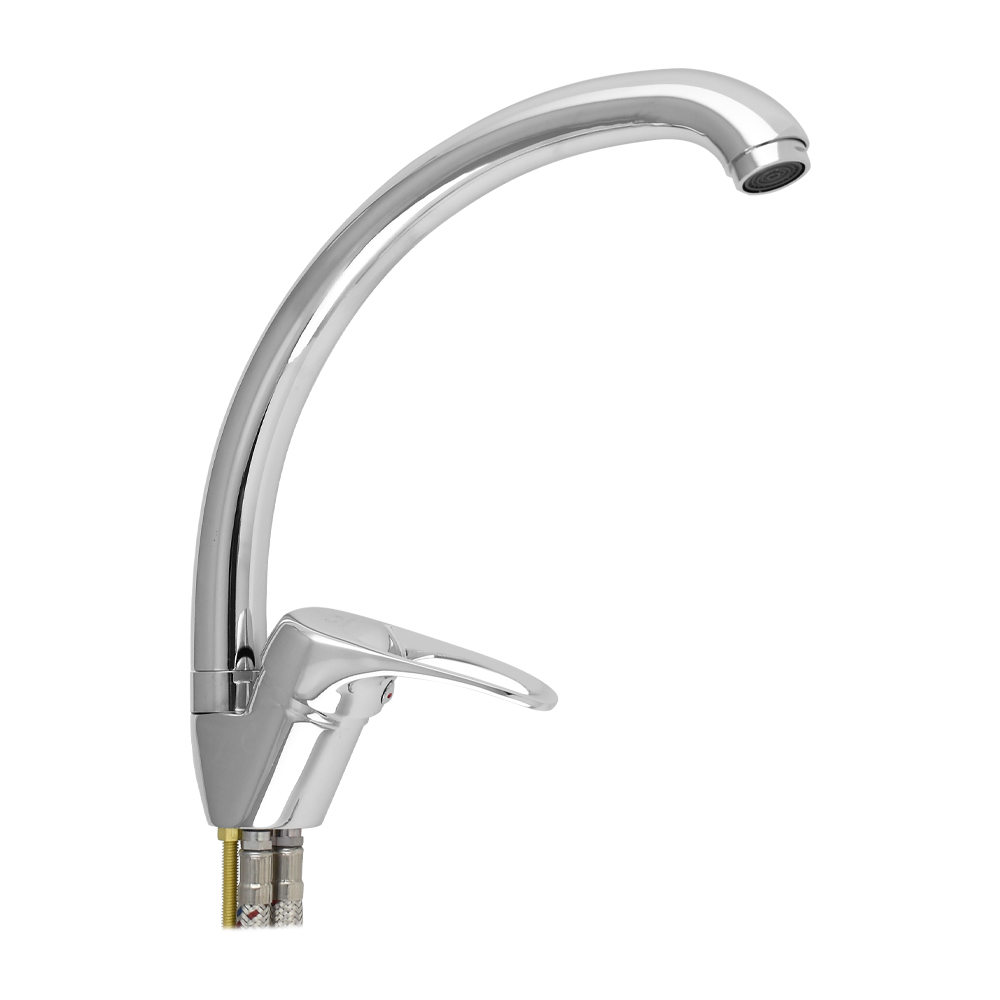 Смеситель для кухонной мойки и раковин, хромированный боковой, с высоким изливом, шаровый. Крепление на шпильке, картридж d= 35 мм, ручка с дыркой. Аэратор для экономии воды. Габаритные размеры: Высота 270 мм, длина 220 мм, диаметр посадочного седла 40 мм, длина подводки 350 мм, вес - 0,980 кг , объём - 0,00280 м3. В комплекте паспорт, корпус с изливом, подводка 1/2, крепеж, набор прокладок.